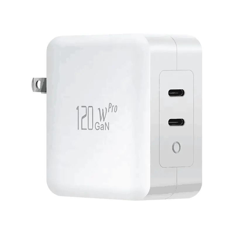Adaptador de carregamento rápido compacto com duas portas USB-C, fornecendo até 120W de saída total para laptops, tablets e outros dispositivos eletrônicos.